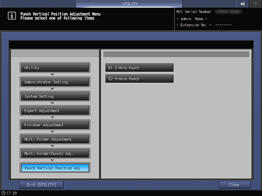 Control panel - Utility/Counter - [Administrator Setting] - [System Setting] - [Expert Adjustment] - [Finisher Adjustment] - [Multi Folder Adjustment] - [Multi Folder(Punch) Adj.] - [Punch Vertical Position Adj.]