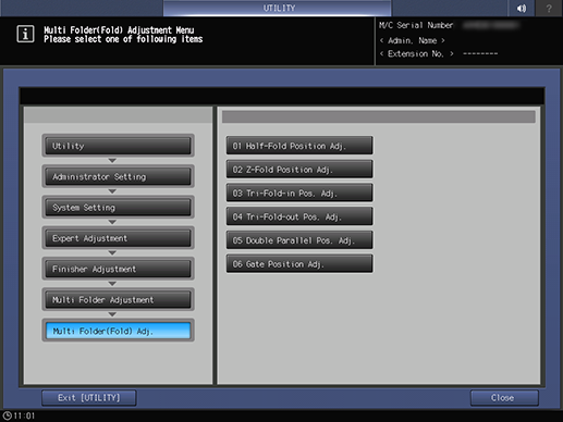 Control panel - Utility/Counter - [Administrator Setting] - [System Setting] - [Expert Adjustment] - [Finisher Adjustment] - [Multi Folder Adjustment] - [Multi Folder(Fold) Adj.]