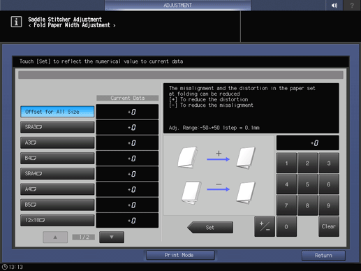 Screen access | Touch panel - [MACHINE] - [Adjustment] - [Finisher Adjustment] - [Saddle Stitcher Adjustment] - [Fold Paper Width Adj.] | ||