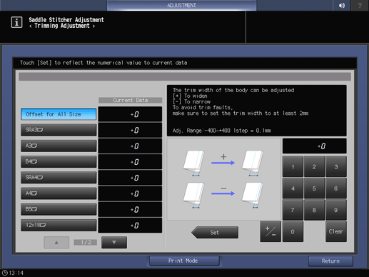 Screen access | Touch panel - [MACHINE] - [Adjustment] - [Finisher Adjustment] - [Saddle Stitcher Adjustment] - [Trimming Adjustment] | ||