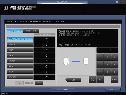 Screen access | Touch panel - [MACHINE] - [Adjustment] - [Finisher Adjustment] - [Saddle Stitcher Adjustment] - [Fold Skew Adjustment] | ||