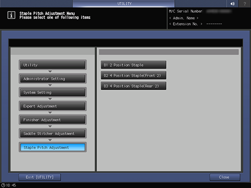 Control panel - Utility/Counter - [Administrator Setting] - [System Setting] - [Expert Adjustment] - [Finisher Adjustment] - [Saddle Stitcher Adjustment] - [Staple Pitch Adjustment]