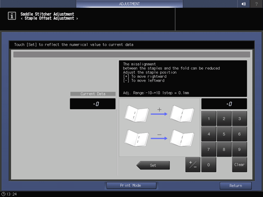 Screen access | Touch panel - [MACHINE] - [Adjustment] - [Finisher Adjustment] - [Saddle Stitcher Adjustment] - [Staple Offset Adjustment] | ||