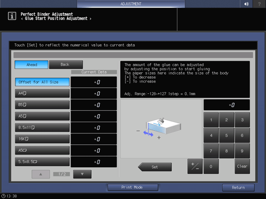 Screen access | Touch panel - [MACHINE] - [Adjustment] - [Finisher Adjustment] - [Perfect Binder Adjustment] - [Glue Start Position] | ||