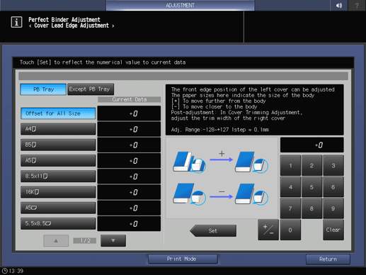 Control panel - Utility/Counter - [Administrator Setting] - [System Setting] - [Expert Adjustment] - [Finisher Adjustment] - [Perfect Binder Adjustment] - [Cover Lead Edge Adj.] | |||