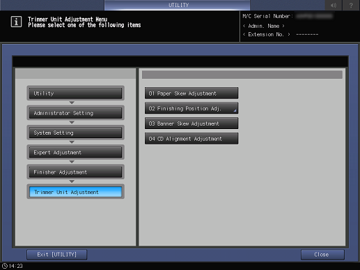Control panel - Utility/Counter - [Administrator Setting] - [System Setting] - [Expert Adjustment] - [Finisher Adjustment] - [Trimmer Unit Adjustment]
