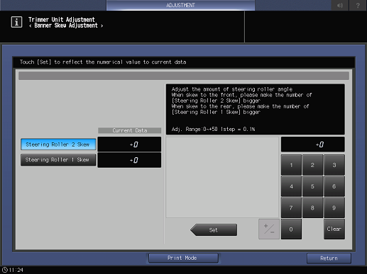 Control panel - Utility/Counter - [Administrator Setting] - [System Setting] - [Expert Adjustment] - [Finisher Adjustment] - [Trimmer Unit Adjustment] - [Banner Skew Adjustment] | |||
