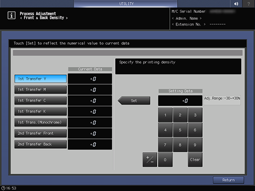 Screen access | Control panel - Utility/Counter - [Administrator Setting] - [System Setting] - [Expert Adjustment] - [Process Adjustment] - [Front & Back Density] | ||