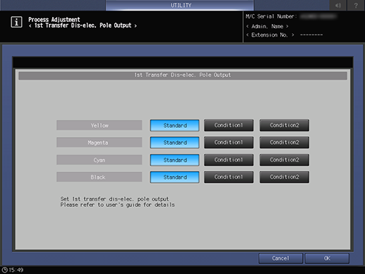 Setting items | -[Standard] | Sets output conditions of the 1st transfer neutralization pole. Sets the appropriate value for [Yellow], [Magenta], [Cyan], and [Black] individually. [Condition1]: Increases the DC voltage. [Condition2]: Increases the AC voltage. | |