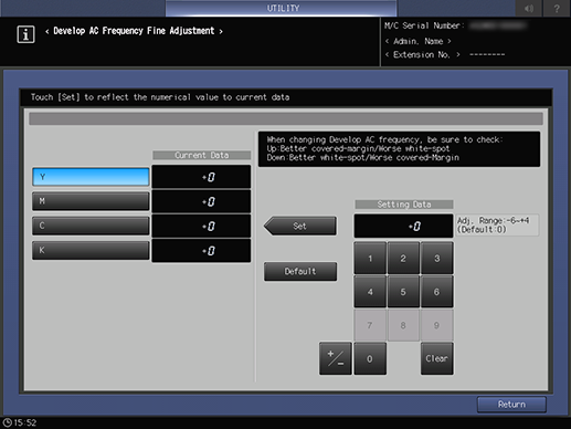 Screen access | Control panel - Utility/Counter - [Administrator Setting] - [System Setting] - [Expert Adjustment] - [Process Adjustment] - [Develop AC Freq. Fine Adj.] | ||