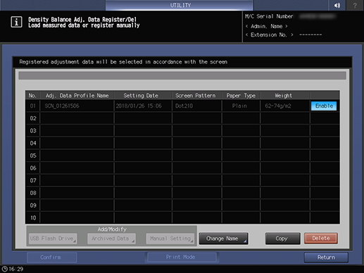 Register density balance adjustment values and correct, duplicate or delete existing data.