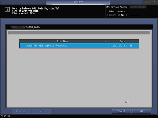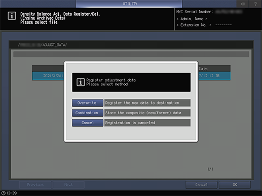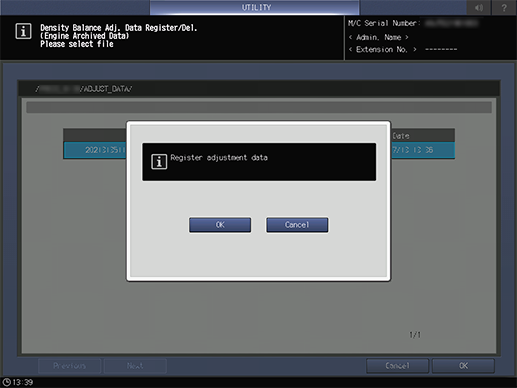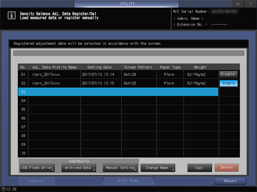 Screen access | Control panel - Utility/Counter - [Administrator Setting] - [System Setting] - [Expert Adjustment] - [Quality Adjustment] - [Density Balance Adjustment] - [Density Balance Data Reg/Del] - [Archived Data] | ||
