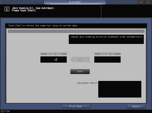 Screen access | Touch panel - [MACHINE] - [Adjustment] - [ADF Adjustment] - [Main ScanDir.Zoom Auto(Back)] | ||