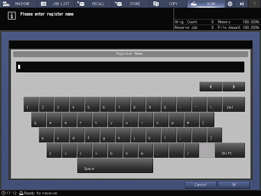 Touch panel - [SCAN]- [E-mail] - [Register/Edit] - [Add] - [Register Name] | |||