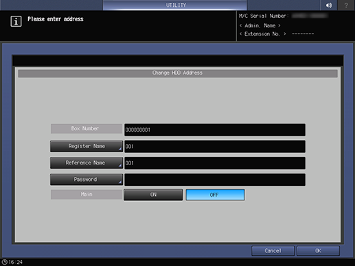 Control panel - Utility/Counter - [Administrator Setting] - [Scan Address Register] - [Address Edit] - [HDD] - [Change]