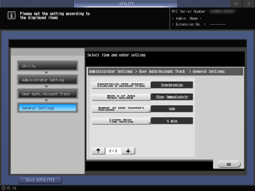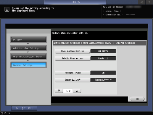 Control panel - Utility/Counter - [Administrator Setting] - [User Auth./Account Track] - [General Settings]