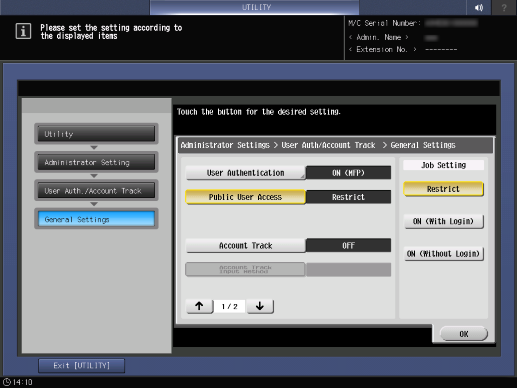 Control panel - Utility/Counter - [Administrator Setting] - [User Auth./Account Track] - [General Settings] - [Public User Access]