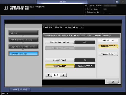 Control panel - Utility/Counter - [Administrator Setting] - [User Auth./Account Track] - [General Settings] - [Account Track Input Method]