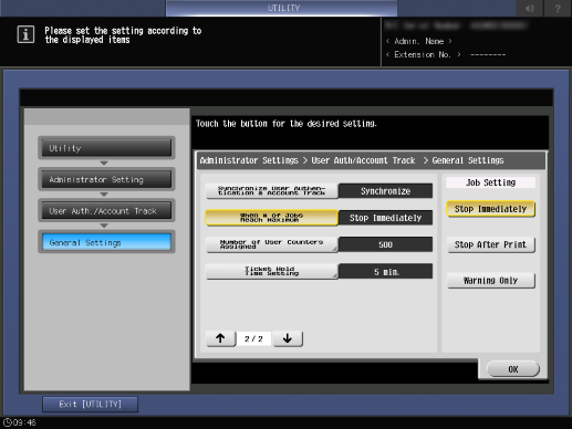 Control panel - Utility/Counter - [Administrator Setting] - [User Auth./Account Track] - [General Settings] - [When # of Jobs Reach Maximum]