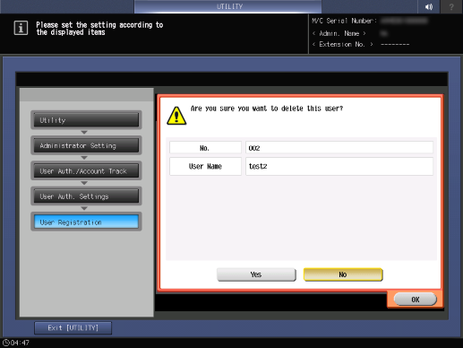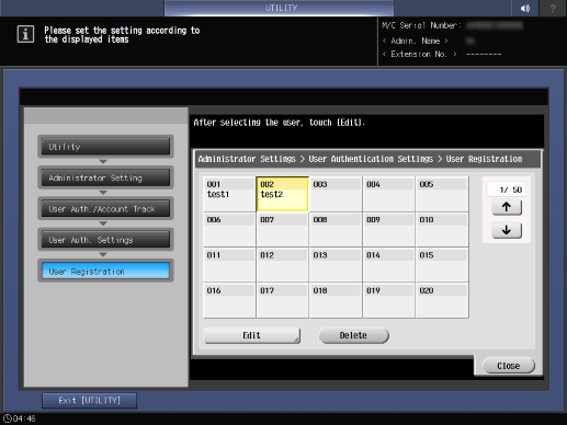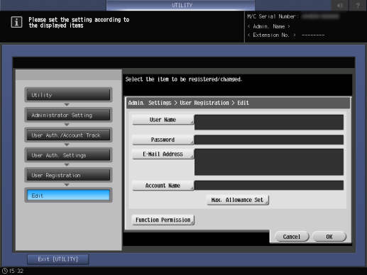 Screen access | Control panel - Utility/Counter - [Administrator Setting] - [User Auth./Account Track] - [User Authentication Settings] - [User Registration] | ||
