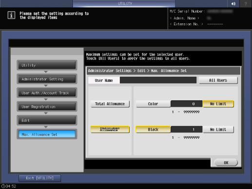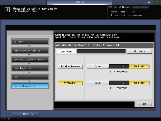 Screen access | Control panel - Utility/Counter - [Administrator Setting] - [User Auth./Account Track] - [User Authentication Settings] - [User Registration] - [Edit] - [Max. Allowance Set] | ||