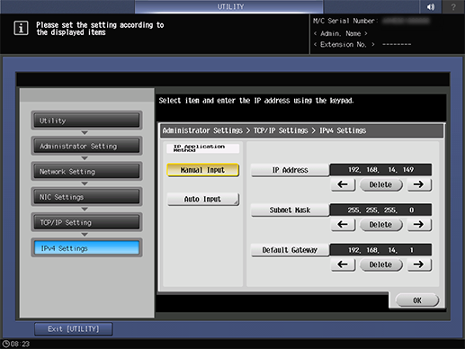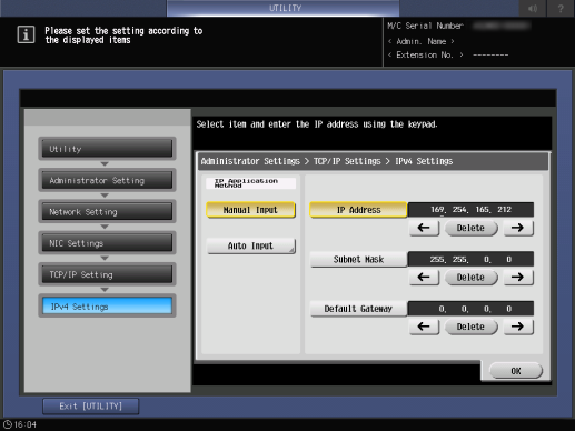 Screen access | Control panel - Utility/Counter - [Administrator Setting] - [Network Setting] - [NIC Settings] - [TCP/IP Settings] - [IPv4 Settings] | ||