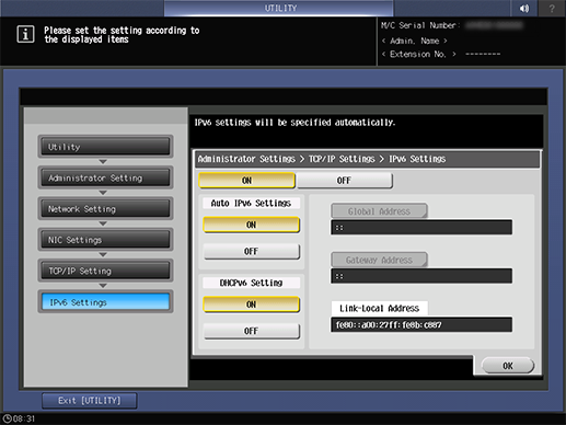 Control panel - Utility/Counter - [Administrator Setting] - [Network Setting] - [NIC Settings] - [TCP/IP Settings] - [IPv6 Settings]