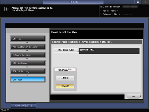 Control panel - Utility/Counter - [Administrator Setting] - [Network Setting] - [NIC Settings] - [TCP/IP Settings] - [DNS Host]