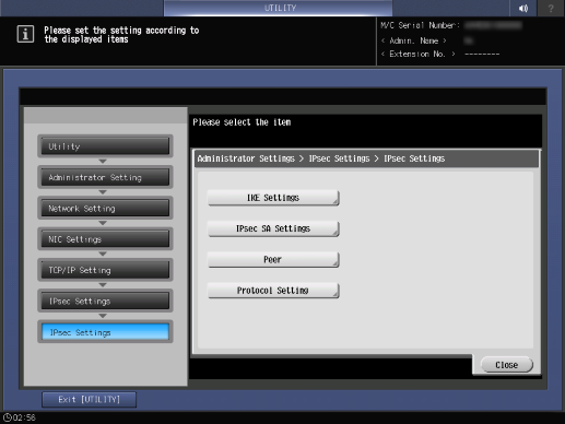 Control panel - Utility/Counter - [Administrator Setting] - [Network Setting] - [NIC Settings] - [TCP/IP Settings] - [IPsec Settings] - [IPsec Settings]