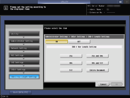 Screen access | Control panel - Utility/Counter - [Administrator Setting] - [Network Setting] - [NIC Settings] - [TCP/IP Settings] - [IPsec Settings] - [IPsec Settings] - [IKE Settings] - [IKEv1 Settings] | ||