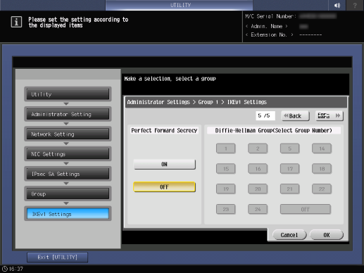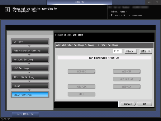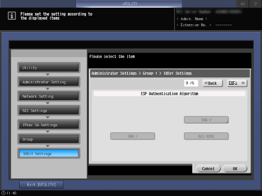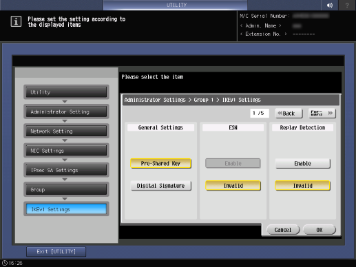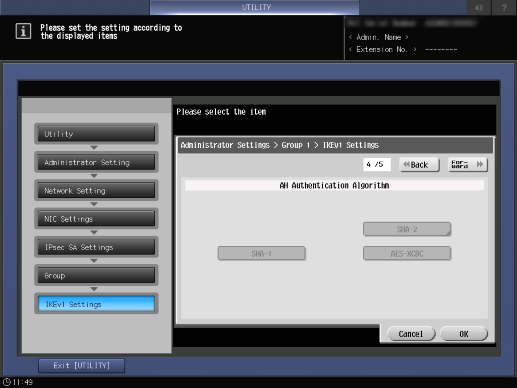 Control panel - Utility/Counter - [Administrator Setting] - [Network Setting] - [NIC Settings] - [TCP/IP Settings] - [IPsec Settings] - [IPsec Settings] - [IPsec SA Settings] - [Edit] - [IKEv1]