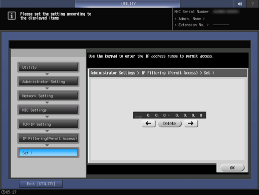 Screen access | Control panel - Utility/Counter - [Administrator Setting] - [Network Setting] - [NIC Settings] - [TCP/IP Settings] - [IP Filtering (Permit Access)] | ||