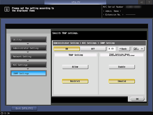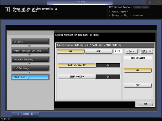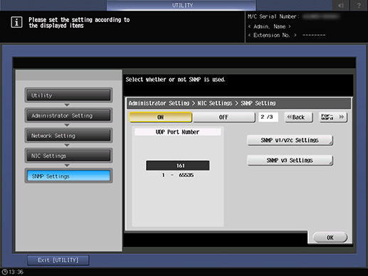 Control panel - Utility/Counter - [Administrator Setting] - [Network Setting] - [NIC Settings] - [SNMP Settings]
