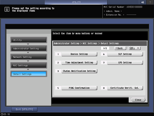 Control panel - Utility/Counter - [Administrator Setting] - [Network Setting] - [NIC Settings] - [Detail Settings]