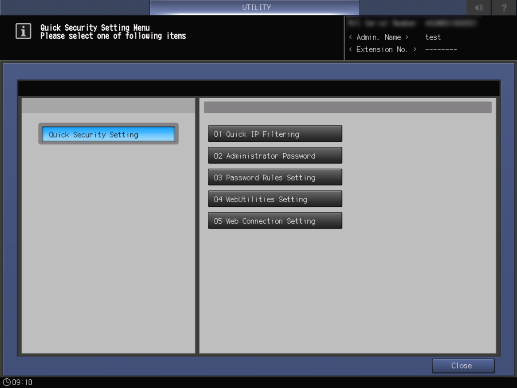 Control panel - Utility/Counter - [Administrator Setting] - [Network Setting] - [Quick Security Setting]