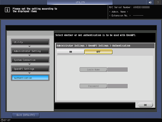 Control panel - Utility/Counter - [Administrator Setting] - [System Connection] - [OpenAPI Settings] - [Authentication]