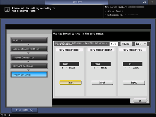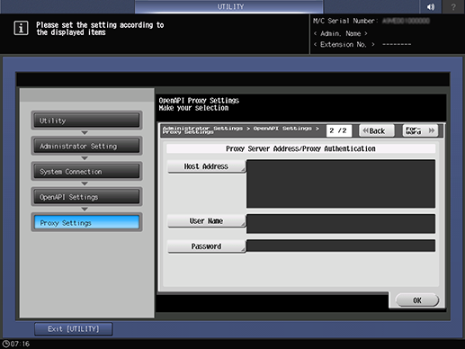 Control panel - Utility/Counter - [Administrator Setting] - [System Connection] - [OpenAPI Settings] - [Proxy Settings]