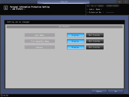 Setting items | [ON] | Enables the personal information protection setting of a job history. If [ON] is selected, you can select whether to display [User Name]. | ||