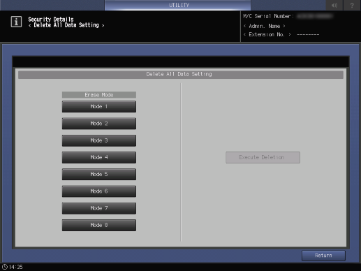Screen access | Control panel - Utility/Counter - [Administrator Setting] - [Security Setting] - [Security Details] - [Delete All Data Setting] | ||