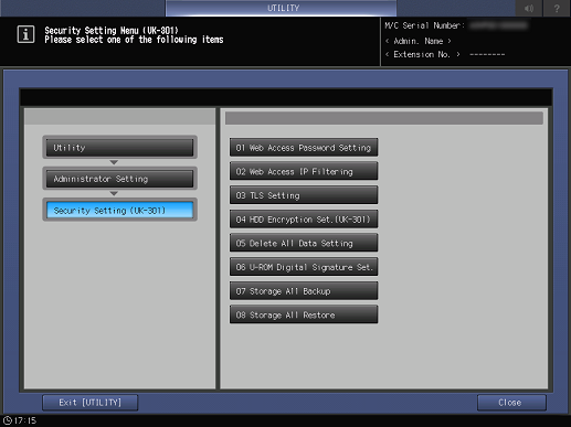Control panel - Utility/Counter - [Administrator Setting] - [Security Setting (UK-301)]