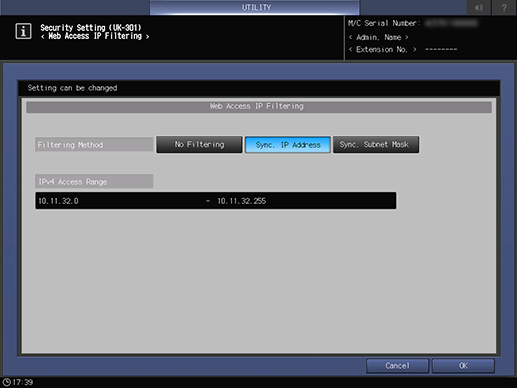 Control panel - Utility/Counter - [Administrator Setting] - [Security Setting (UK-301)] - [Web Access IP Filtering]