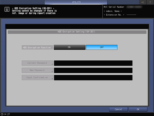 Control panel - Utility/Counter - [Administrator Setting] - [Security Setting (UK-301)] - [HDD Encryption Set.(UK-301)]