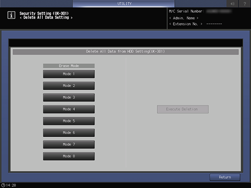 Control panel - Utility/Counter - [Administrator Setting] - [Security Setting (UK-301)] - [Delete All Data Setting]