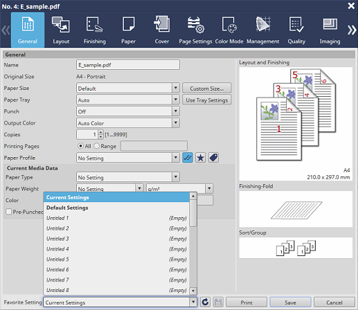 This function allows you to apply the set content and print, or register a print setting as a favorite setting.