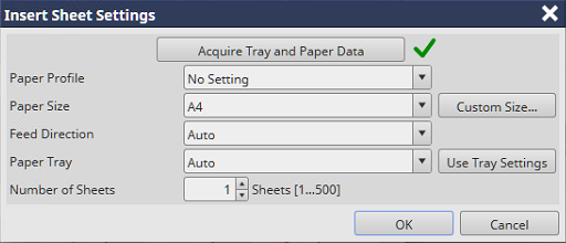 Setting items | [Acquire Tray and Paper Data] | Acquires the paper tray and paper information of this system. When information is acquired, " | ||