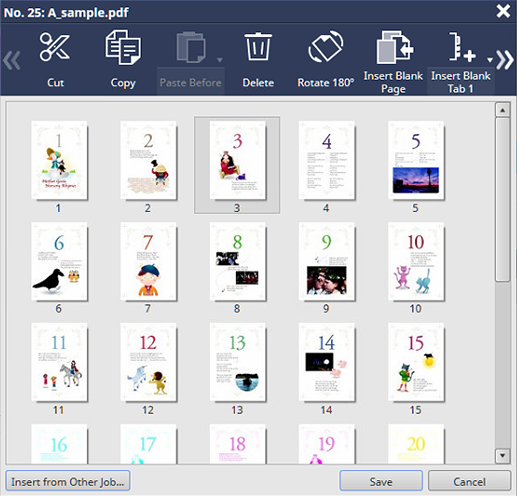AccurioPro Print Manager - Select a job, and right-click. - [Page Edit...] - Select an image page. - Select [Append Blank Tab 1] or image page. - [Insert Blank Tab 1] | |||