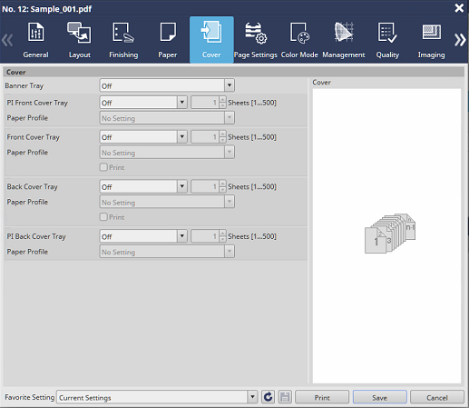 AccurioPro Print Manager - Select a job. - [Job Management] - [Job Settings...] - [Cover]