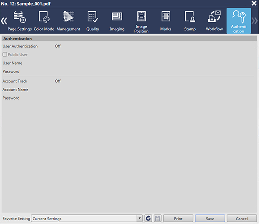 AccurioPro Print Manager - Select a job. - [Job Management] - [Job Settings...] - [Authentication]