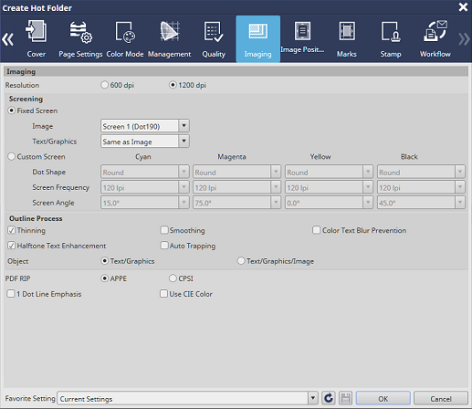 AccurioPro Print Manager - [Configuration] - [Hot Folder Configuration...] - Right-click a hot folder - [Edit...] - [Imaging]