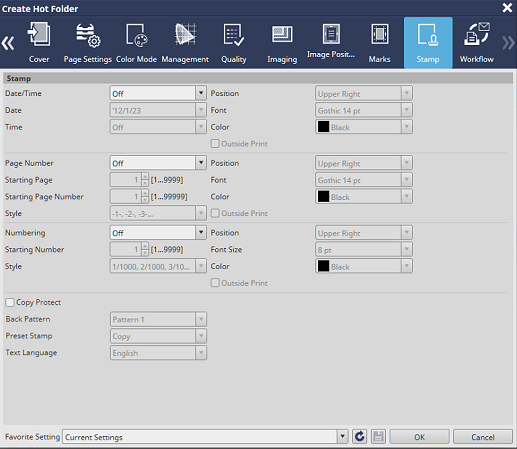 Touch panel - [CNTL] - [Configuration] - [Hot Folder Configuration...] - Right-click a hot folder - [Edit...] - [Stamp]